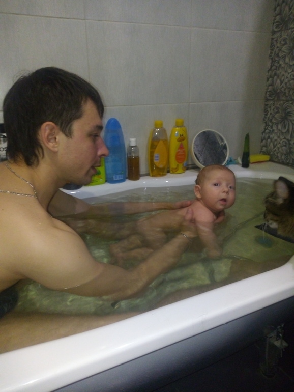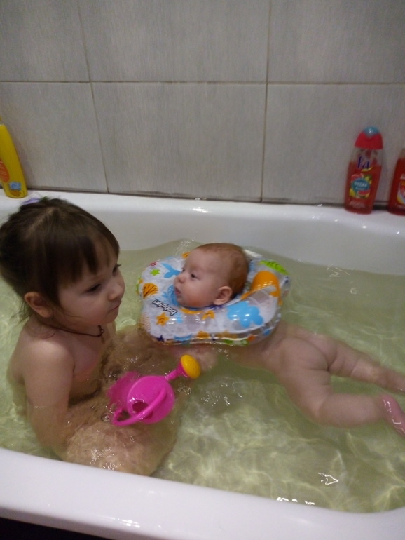 Лиза очень любит купаться, в ванной может быть и по 20 минут,даже больше, но у папы и мамы сил не хватает. Так как сначала она плавает в круге,А потом требует руки))0
