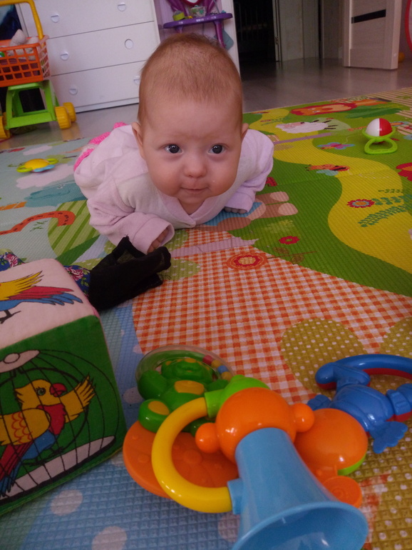 хорошо держит головку, может надолго лежать на животике и смотреть, что в "мире"делается ))), тянется за погремушками, может их держать,если вложить в ручку, а вот сама не берет)))