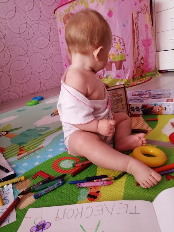 Очень любит "рисовать" и играть с Машей в лего, даже пробует сама соединять детальки) кубики может поставить 2 штучки, но чаще отпуская ручку сваливает свое строение)