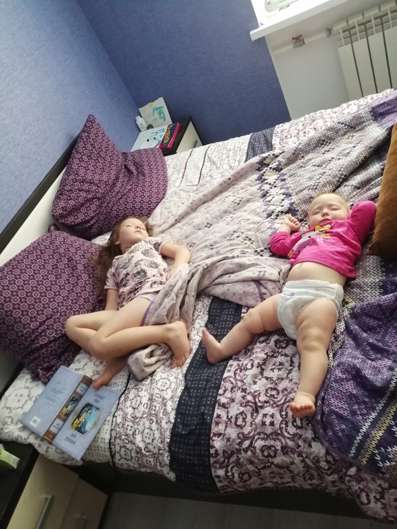 Сон. Да.... Он у нас можно сказать совместный. Так как днем она спит сама хорошо, причём когда она хочет спать, она просто просится на ручки и просит грудь. И получив почти тут же засыпает) а вот ночью... Может просыпаться каждый час. И только рядом со мной спит. А иногда..... Точнее сейчас 2 ночи из 3 ещё и Маша спит с нами😲🤪в общем мне нужна кровать на всю комнату😂😂😂
