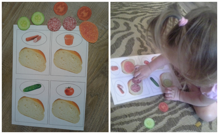 Следующий заказ - бутерброды. Здесь игра на восприятие «часть-целое». И самодельные наклейки из двустороннего скотча.