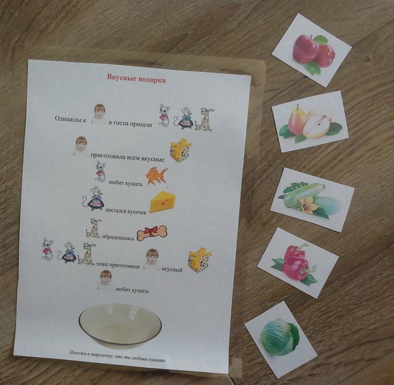 Читаем историю в картинках про саму Ульянку «Вкусные подарки». Кладём в тарелочку то,что любим кушать из предложенных карточек