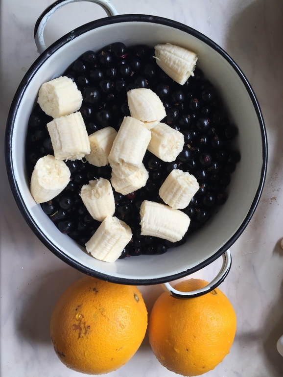 Ягоды, банан и апельсин (выжимаю сок с мякотью, можно просто очистить и постараться удалить перепонки), цедра апельсина перемалываются в блендере.