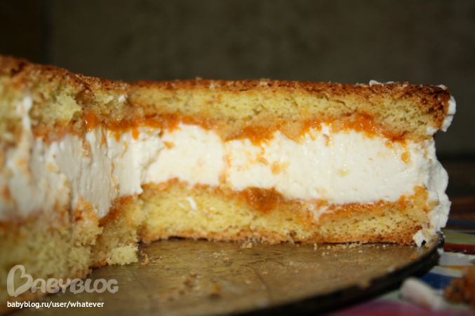 была у нас сегодня. просто так, упал глаз на банку абрикосового варенья (дольки абрикосок прокипяченые в сиропе) и нарисовалась идея! быстро испекся бисквит, разрезала и на балкон, на мороз быстро остывать. в это время сделали крем: взбили немного сметаны с сахаром, добавили немного йогурта и желатина чтоб застыло. промазали и снова на мороз, так за два часа все было готово и накормила я своих мужиков сладеньким)))