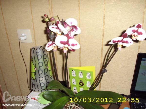 Мои любимые цветы - орхидеи. Говорила мужу, что хотела бы заняться разведением для самой себя, чтоб любимые цветочки всегда были со мной... Самой хотелось бы выращивать и ухаживать, срезанные - не такое удовольствие все-таки. Ну вот он насюрпризил :D на 8 марта преподнес мне сыночка. Это мой первый орх, потому сейчас я на истерике, кипише, переживаю очень за его здоровье, окопалась в орхо-форумах...