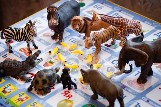 Откровенно говоря, мне было лень печатать и склеивать, поскольку знала я, что плод трудов моих проживет недолго. Почесав репу, я вспомнила, что у меня есть застывающая масса для лепки и пустила ее в ход. Скульптор из меня тот еще, но если не придираться, то бананы опознать можно. Итак, первым делом мы собрали десять зверей и выдали им десять бананов. Несколько раз пересчитали. Обсудили, что бананы желтые и вкусные и т.п.