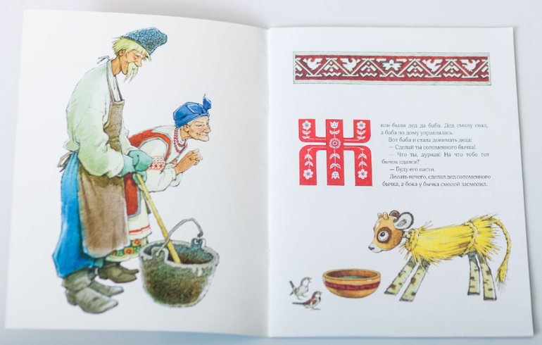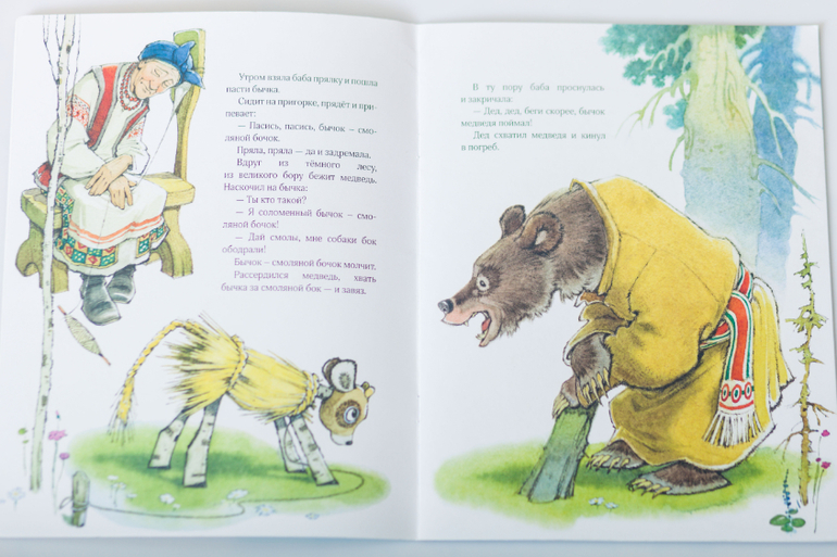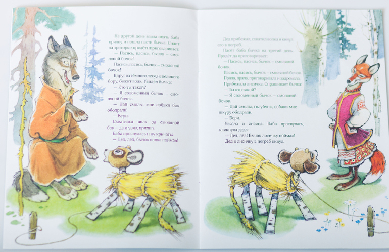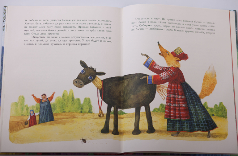 Раньше Левка эту книгу очень любил. Но сейчас читаем про бычка сказку именно в сборнике. И, надо признать, что вариант в сборнике более правильный с точки зрения морали. В нечаевском варианте дед запугивает зверюшек до смерти и отпускает под честное слово, что они принесут ему выкуп. С сборнике звери сами обещают бабушке и Танюшке (кстати, у Нечаева вообще Танбшки нет, а бычка у деда выпрашивает бабка) подарки и те их отпускают без особых ожиданий. Звери сдерживают свое обещание в обоих вариантах. В общем, выбирайте какой вам больше по душе. А мне даже нравится, что у нас их два:)