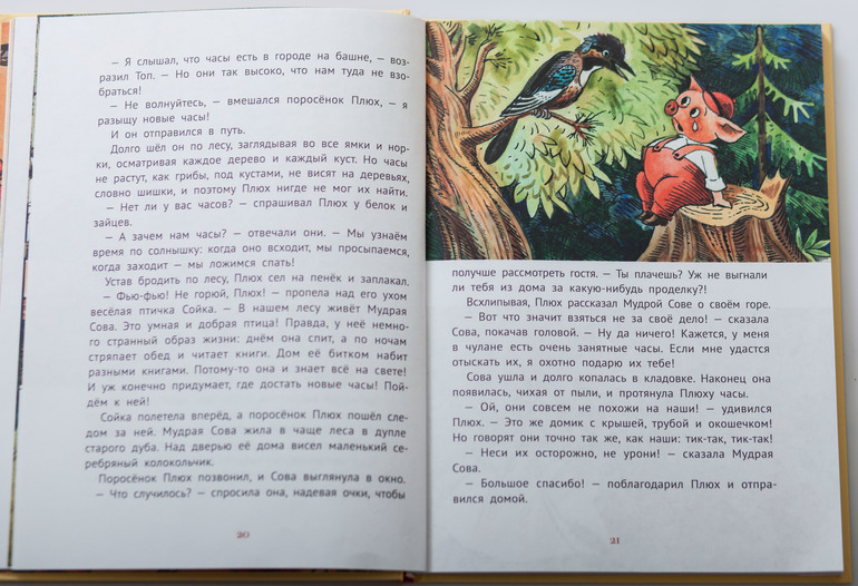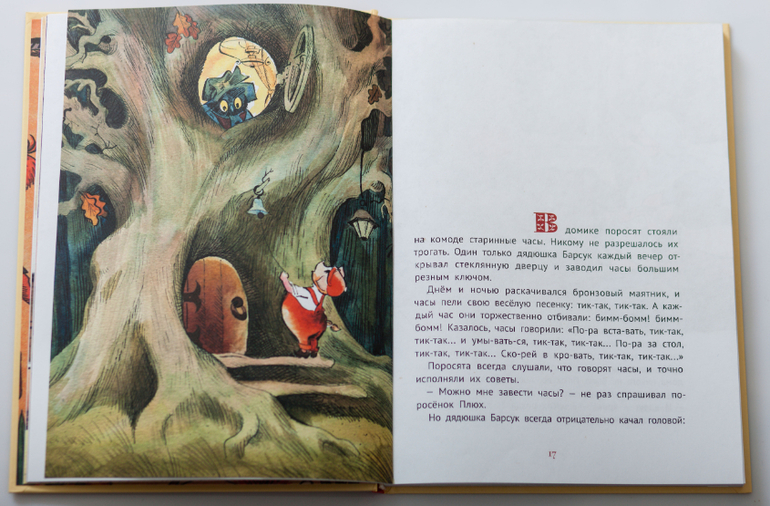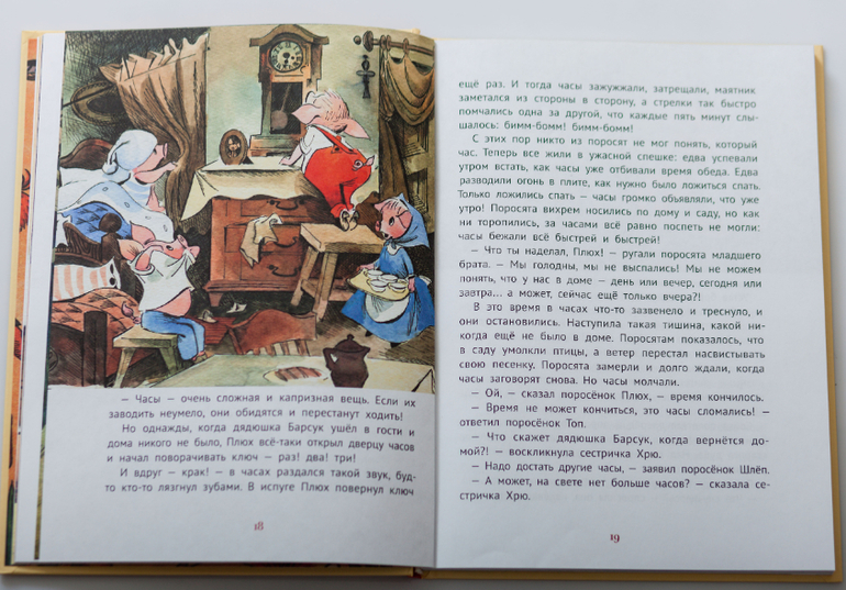 Риск оправдался. Хотя и не сразу, но книга уверенно выбралась в любимчики и остается в их рядах уже второй месяц. Мы пока прочитали не все истории. Поэтому я думаю, что хватит ее еще надолго. Относительным минусом этой книги можно назвать то, что картинки не всегда соответствуют тексту, да и их не так много. То есть они есть на каждом развороте, но текста значительно больше и не каждое действие проиллюстрировано. Для нас это отличная тренировка, плавный переход к чтению без картинок. Но надо быть готовым к вопросам, "а где это нарисовано", если до того вы читали только книги с большим количеством картинок. Сами истории не слишком полны так называемого "экшна", скорее напоминают "зарисовки из жизни одного поросенка". Но нам с Левкой нравится славный Плюх. Покажу вам развороты нашей любимой истории про то, как Плюх сломал часы и приобрел новые:)