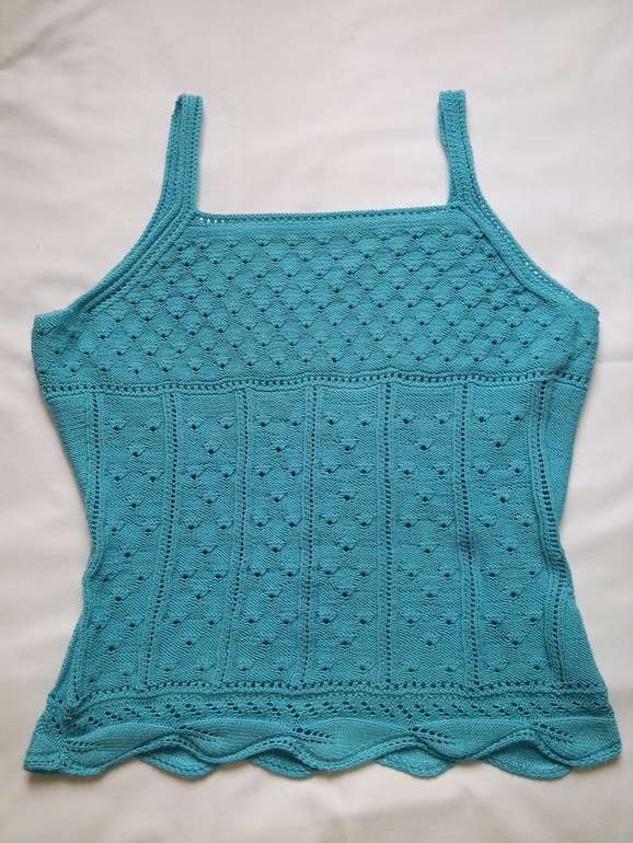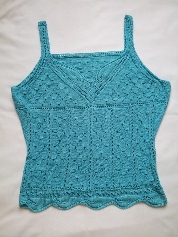 Связала себе любимой летний топ. Долгое время не решалась за него взяться, но потом все же решилась :) Не пожалела!!! Пряжа Alize Diva Stretch 400 м/ 100гр, спицы № 2,5 расход 2 мотка. Топ вязали на осинке. Там взяла описание и схемы. Я вязала по кругу, разделила уже в районе проймы. Топ получился без швов (не считая маленьких на бретелях и нижних листочках)
