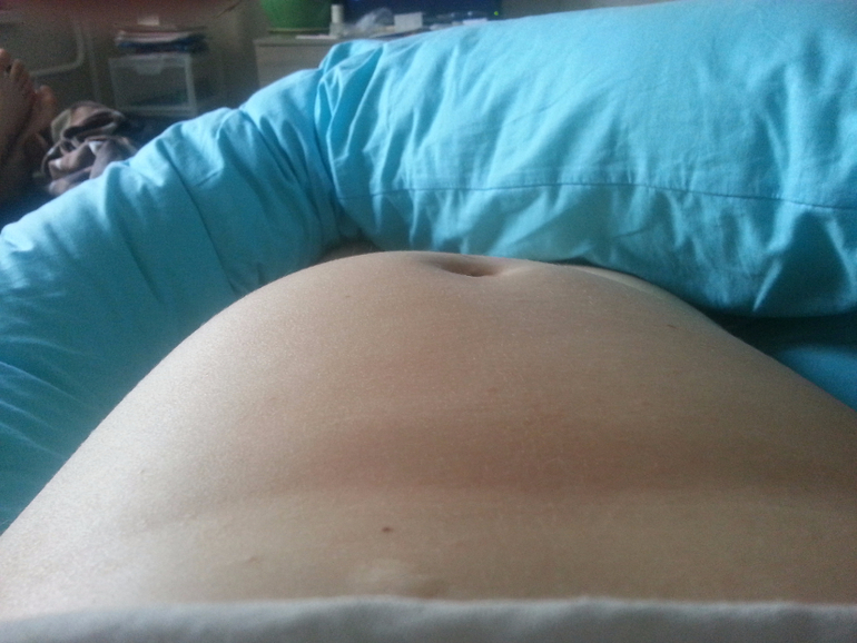 Решила поделиться забавной фоточкой своего перекошенного живота, сын перевалился на левую сторону и живот перекосило туда же)) Интересно, чем он так упирается)