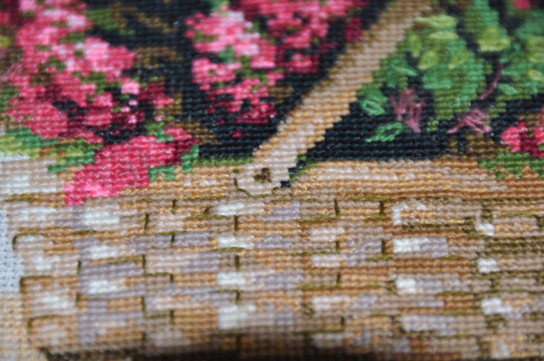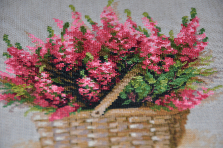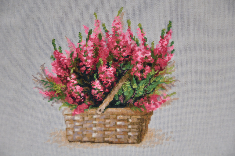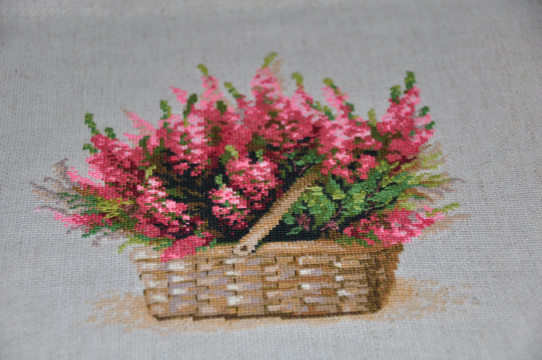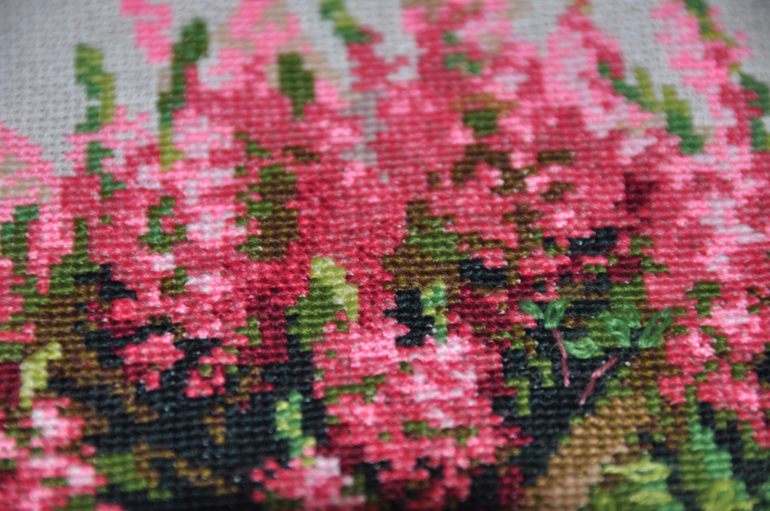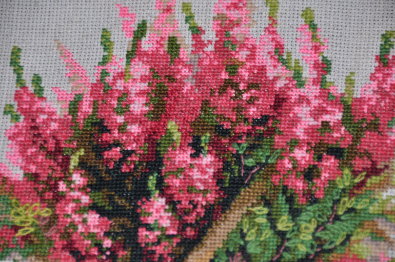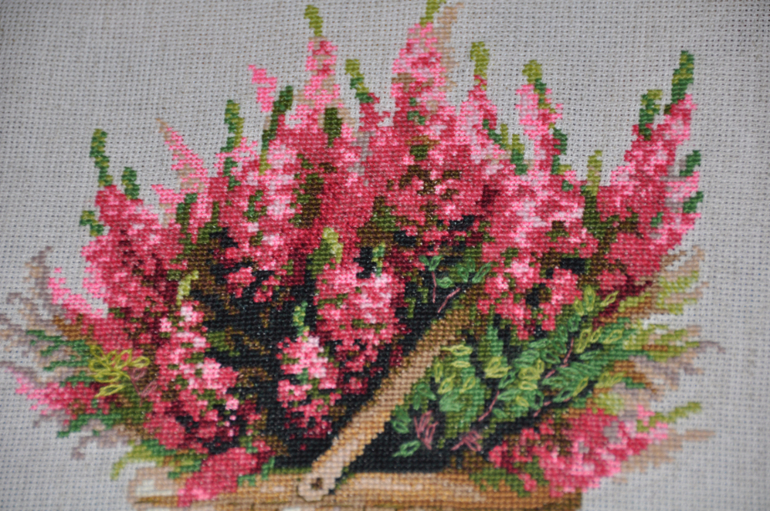 довольно быстро вышился вереск - подбором из своих ниточек - тоже шерсть. Заменила канву на более мелкую, и из просто розового - положила ярко-розовый. вот что вышло)