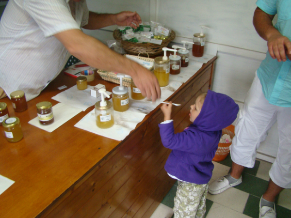 Саша тут же поскакала к баночкам с ложкой, впервые попробовав мед, не желая пропустить вкуснотищу.