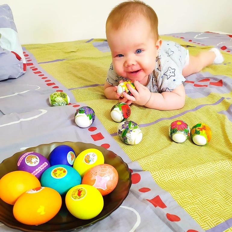 Мама дала новые разноцветные игрушки. Но они не кусаются что-то и в ротик совсем не помещаются. Зато как весело катаются по полу и за ними можно ползать. А вот красивый хлебушек с белым верхом, который зовётся Пасхой, мама не дала попробовать, говорит мне ещё рано. Но ничего, скоро я вырасту и надкушу каждую Пасочку, чтоб узнать, какая вкуснее😋