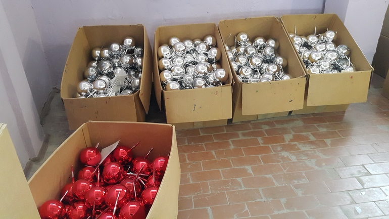 Чтобы придать блестящий цвет, игрушки помещают в вакуумную камеру. Предварительно откачав воздух, расплавляют алюминиевую фольгу, которая оседая на стекле, равномерно окрашивает в зеркальный цвет игрушки.