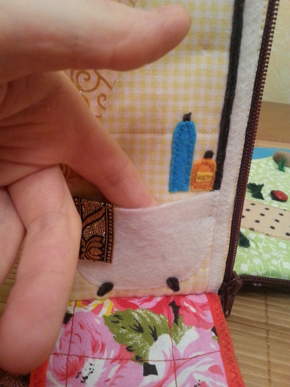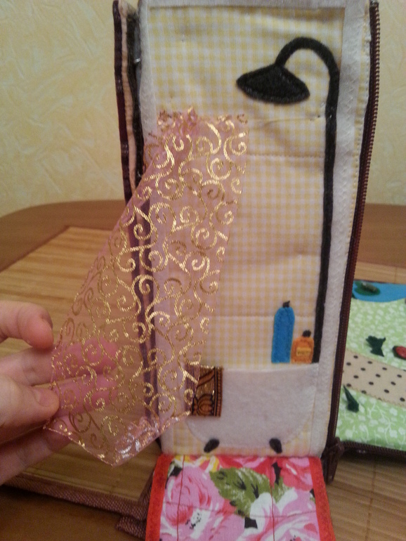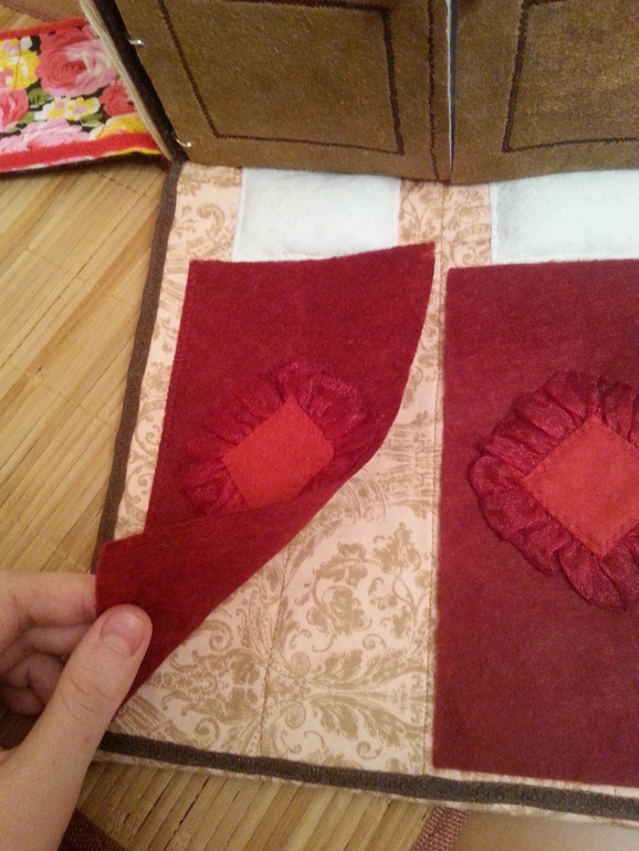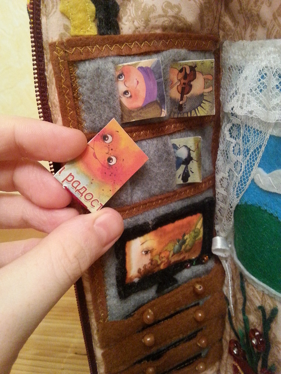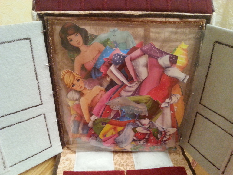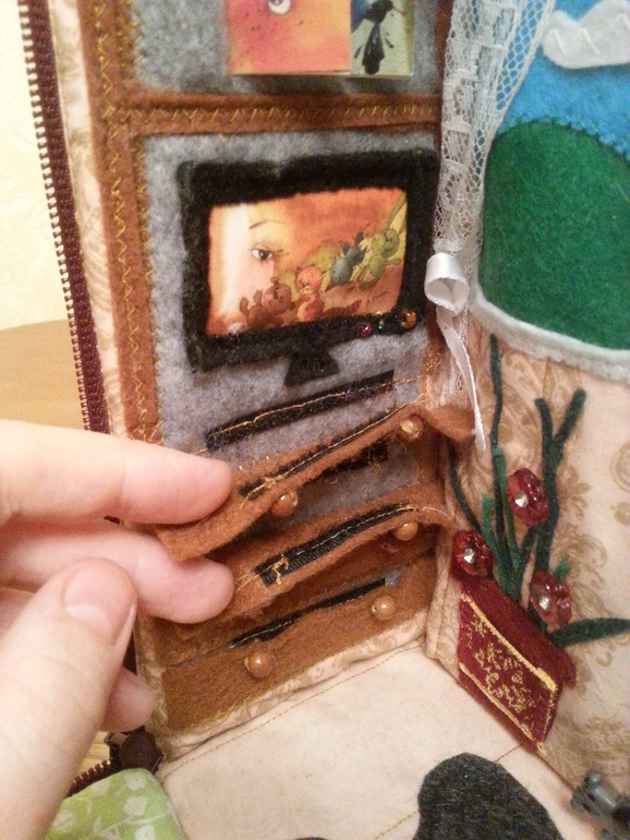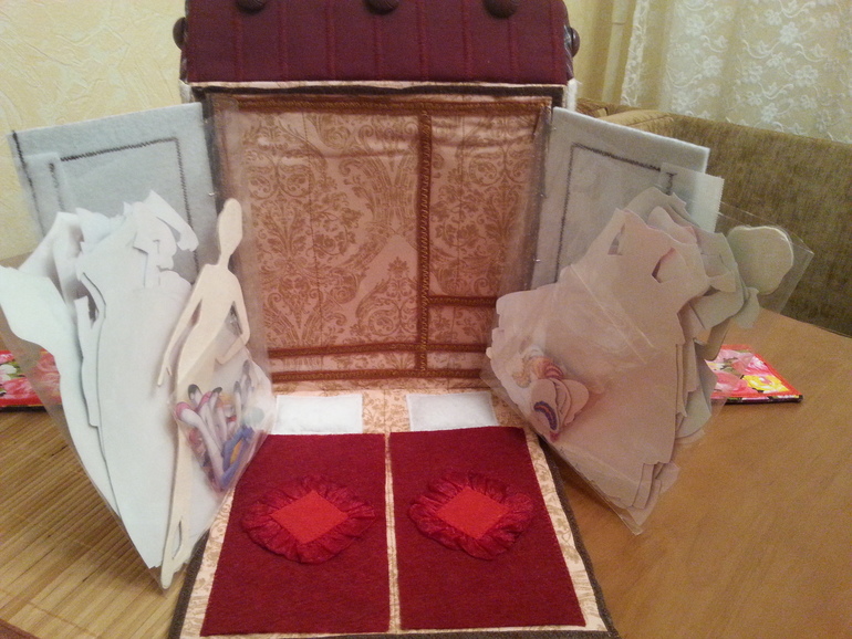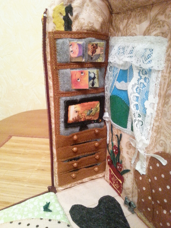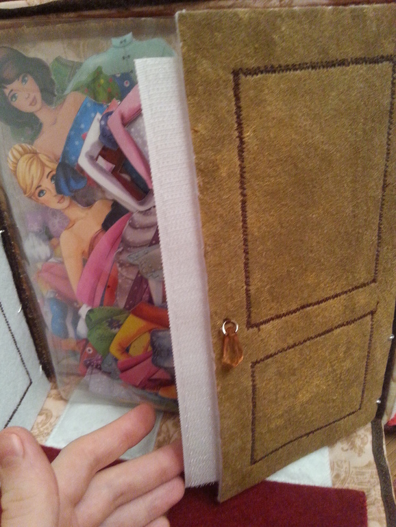 Ящики у книжного шкафа открываются (на липучках), внутри пристрочен пластик, чтобы можно было приклеить на него какие-то детали туалета (ожерелья, например) :))