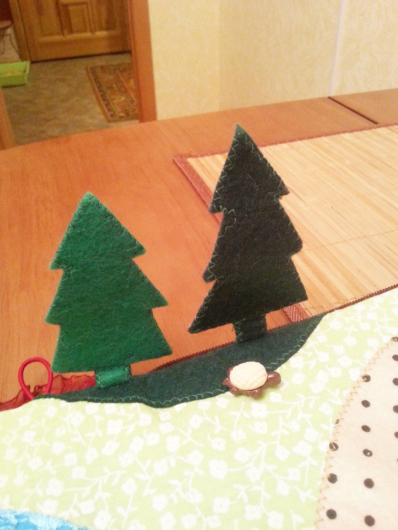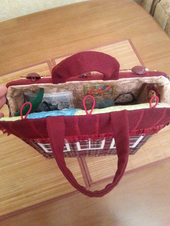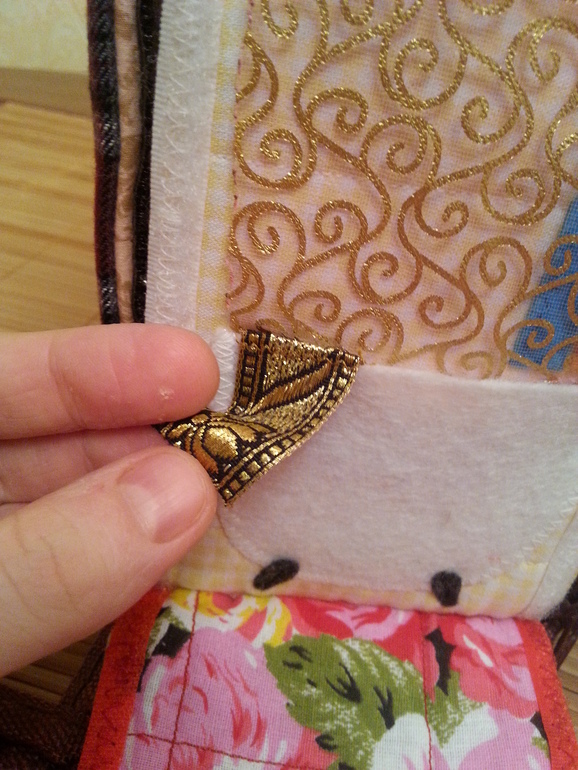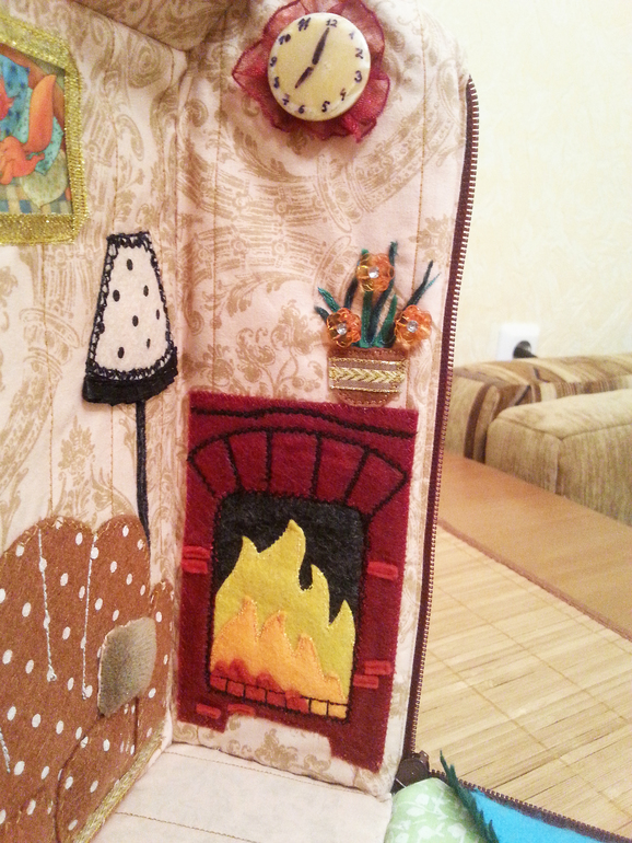 Каждую "стену" вначале уплотнили синтепоном, пристрочила все детальки, затем собирала. Внутрь основных стен и крышу вшила картон, ко дну пришила четыре плоских пуговицы-ножки.