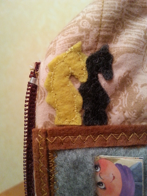 Сверху - шахматные фигуры лошадей, у нас такие в самом деле стоят в квартире. Отсюда же и форма коврика - у нас перед камином лежит меховая шкурка такой точно формы.