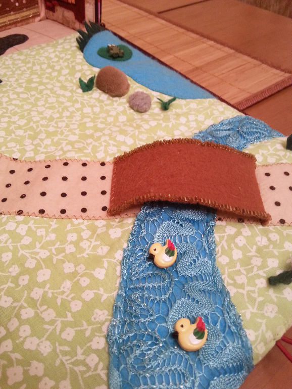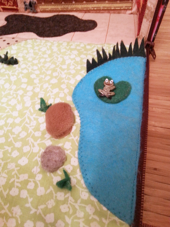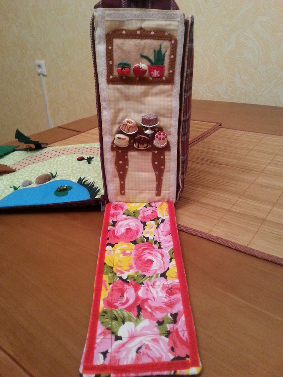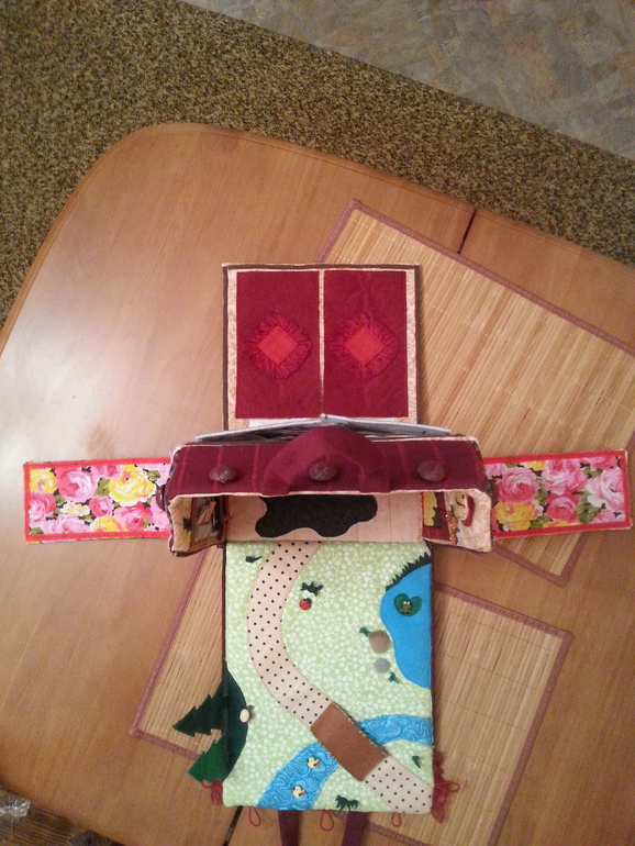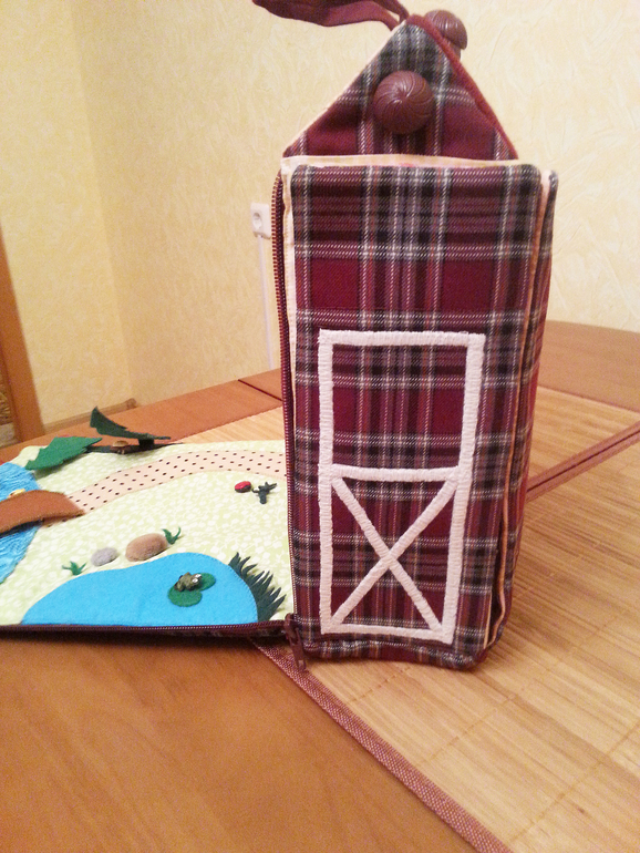 Выкройки домика бродят по интернету, я делала свою - под рост кукол, высота дома получилась 25 см, ширина 10 см. Скат крыши - 7 см. Удобная сумка вышла, можно брать с собой в поездку, ну, или как у нас - квартира небольшая, поиграли - и убрали.