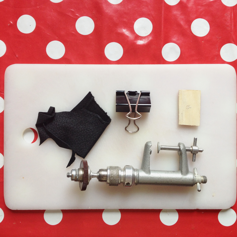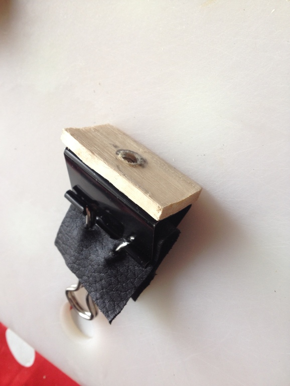 в девевяшечке сверлим дырочку, ткань обрезаем по размеру скрепки, чтоб вложить и закрепить.