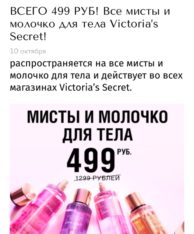 В Victoria's secret с 10 по 13 октября мисты и молочко для тела продаются по 499 р вместо 1299!