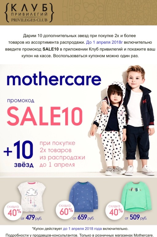 При покупке 2-х и более товаров из распродажи в розничных магазинах Mothercare.