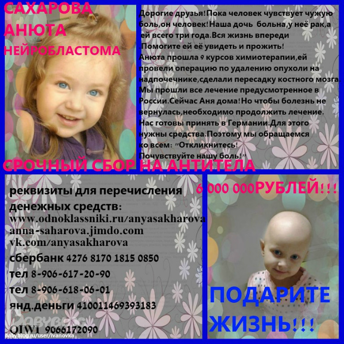 Перевод на мобильный телефон: +7 906 617 2090 номер мамы Марина Сахарова ( на него можно переводить деньги для Ани, потом деньги с номера выводятся на счет в банке)