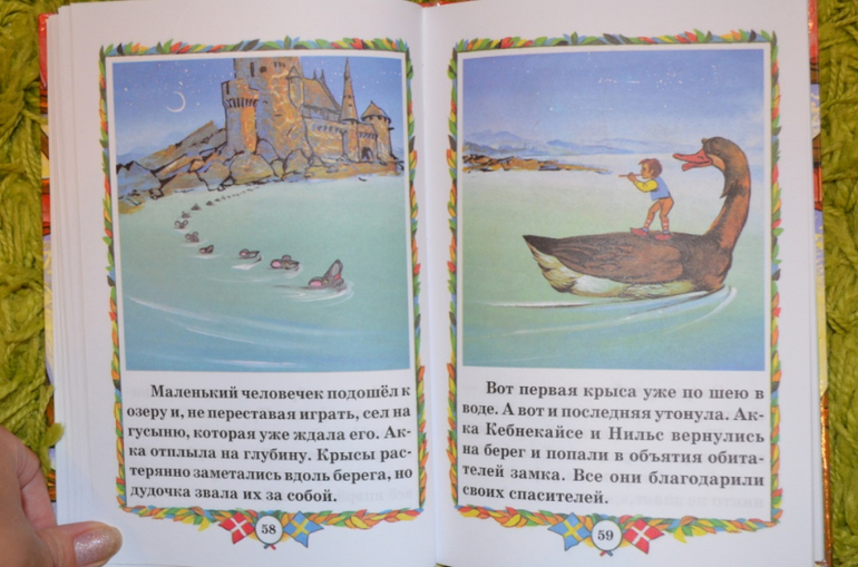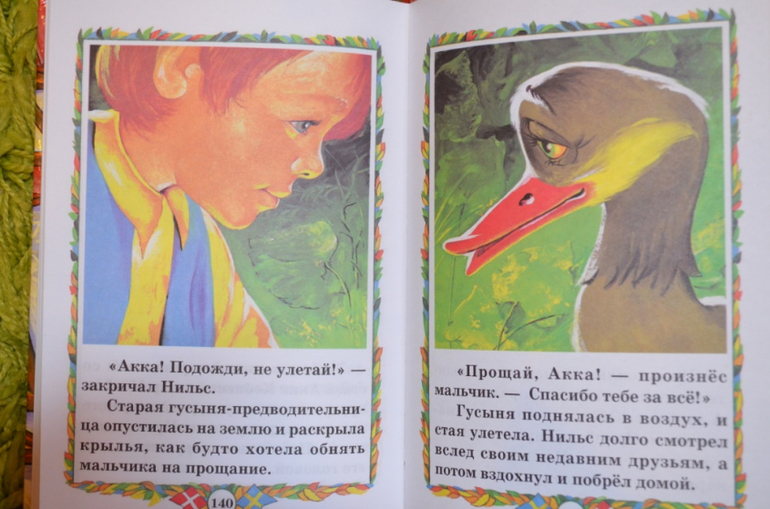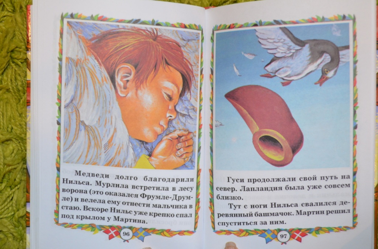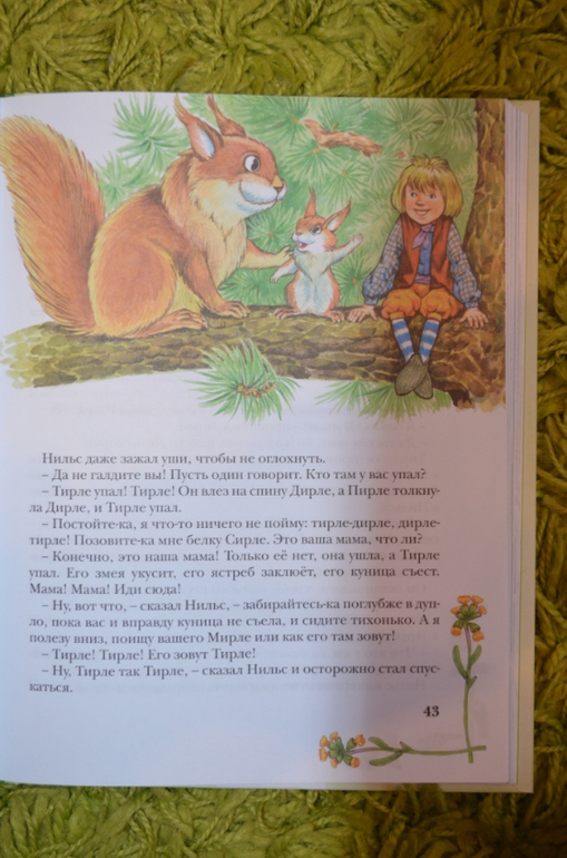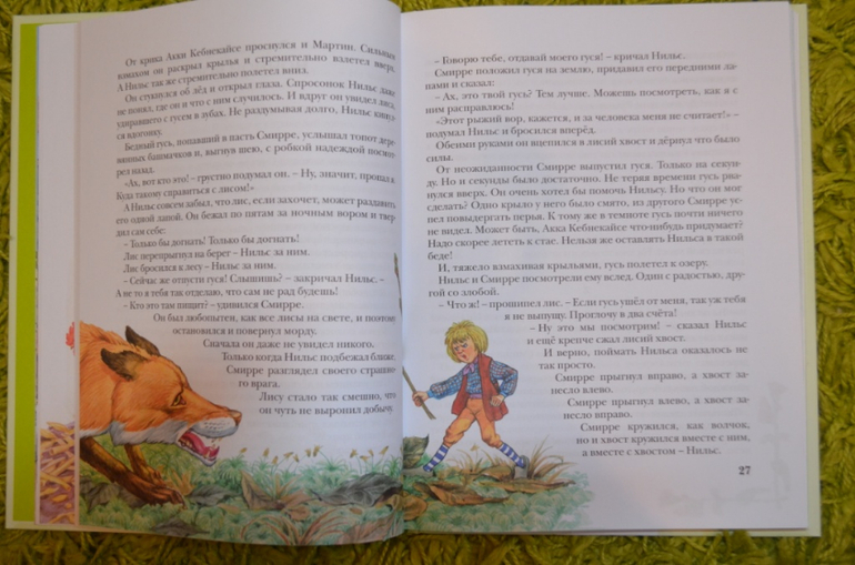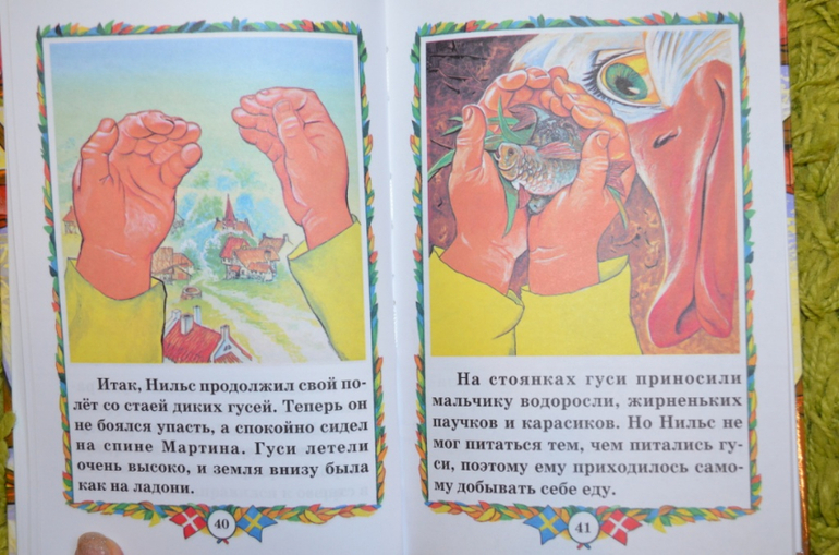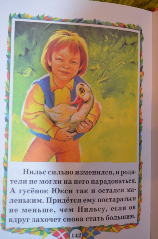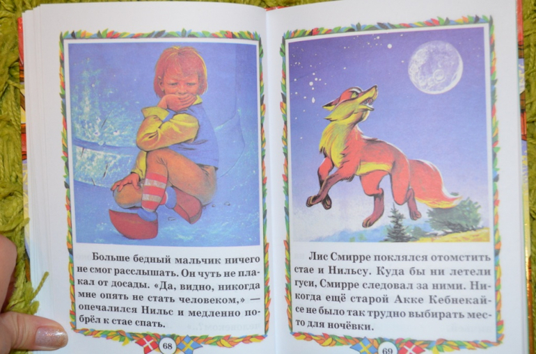 купила давненько. Книга красивая, обложка лакированная, шрифт удачный, листы офсет. Но нам до этой книги ещё расти и расти....Думала, что в книге больше иллюстраций, но ошиблась. По 2-3 разворота без иллюстраций или с маленькими картинками. На данный момент (дочке 3,3 года) нужны иллюстрации на каждой странице. Поэтому стала искать Нильса в сокращении и с большим количеством иллюстраций. На момент заказа в наличии была книга . Решила попробовать и заказала её. Книга не большого формата. Листы офсет. Шрифт крупный, жирный. Для самостоятельного чтения то, что надо. Иллюстрации мне понравились. Только вот эти рамочки....