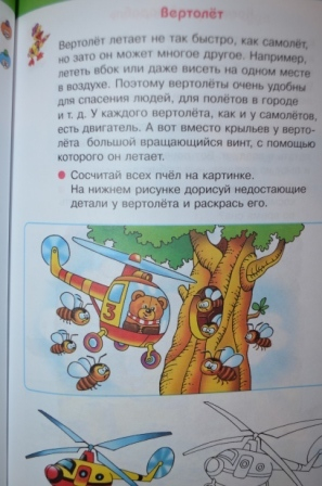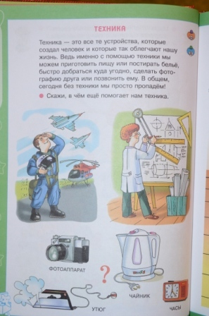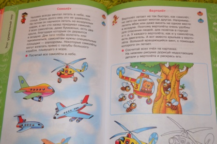 в первой книге есть развороты с информацией про животных, в этой про технику-автомобиль, самолет, вертолет, космический корабль, речные и морские суда, телефон, компьютер, поезд