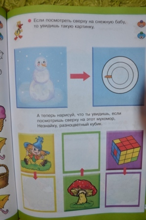 не знаю, кто придумал задания, которые на странице под снеговиком...нарисовать, что видно сверху. Думаю, что и не каждый взрослый сможет это сделать))