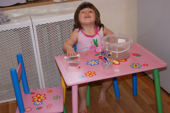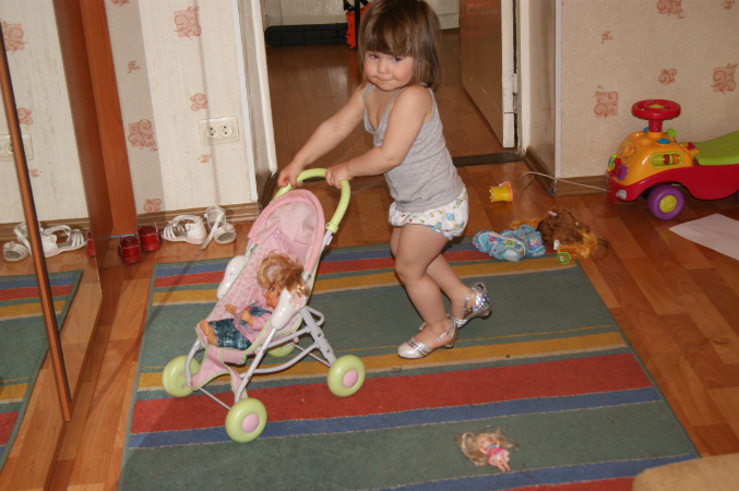 Красотка)) Особенно понравилось с коляской на каблуках)). А гречку потом по всему дому собираете?)) или она аккуратоно играет?