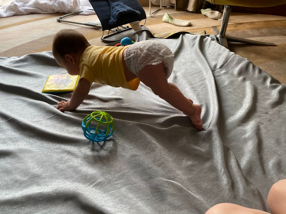 Дочке 6,5 м. Пока не ползает, из планки перешла в позу собака мордой вниз, но не на стопе, а чуть ли не на одном пальце. Я так понимаю из за повышенного тонуса в ногах. Потом встает на колени, раскачивается. Руки не поймет как передвигать, показываем, все без толку.