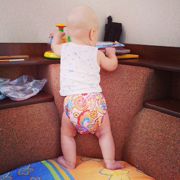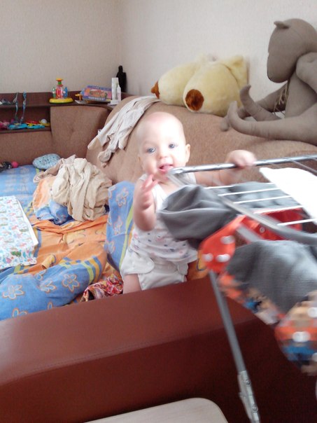 На днях, дочь обнаружила рядом с диваном бельевую сушилку и очень обрадовалась)) теперь это её любимое место и развлекается она расшатывая её во все стороны.