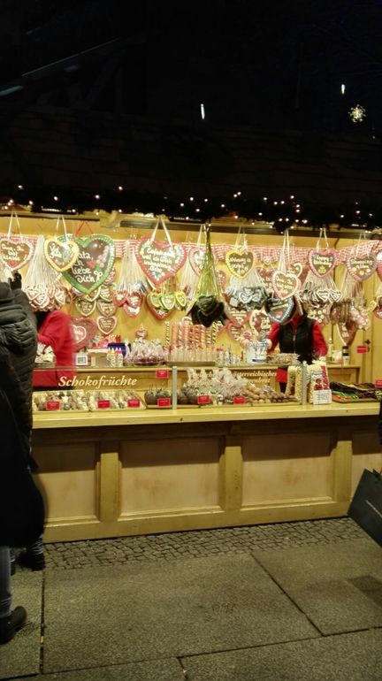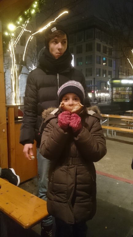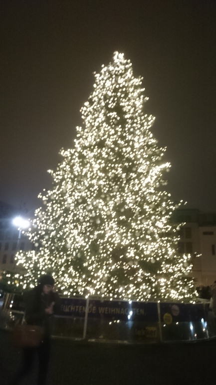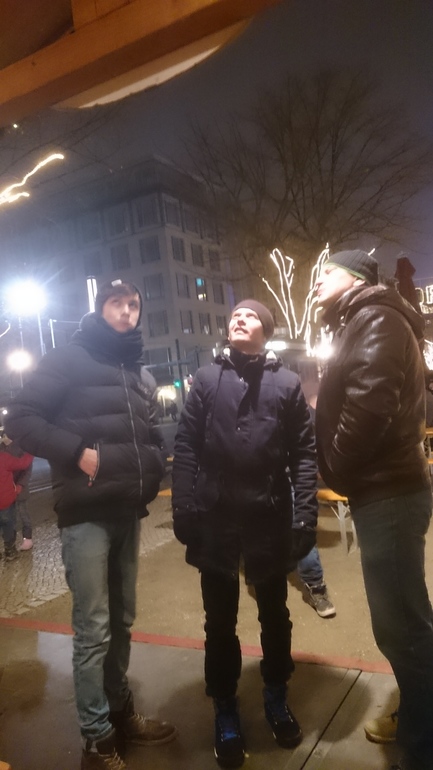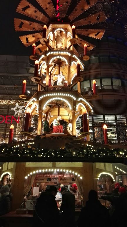 Поехали на Potsdamer Platz, были наслышаны о шоу, что там проходит. Там встретились с друзьями( знали, что они тоже собираются, но не знали когда) в общей сложности нас набралось 10 взрослых от 15 до 45 лет и двое ребятишек. посмотрели шоу, попили глинтвейн, съели булочек с сосиской, Кума прокатила малышей в карете, и пошли мы гулять дальше пешком дошли до бранденбурских ворот, проходя под ними, загадали желание, и по unten den Linden дошли до Aleksanderplatz. Там прокатилась на колесе, и счастливые поехали домой. И ещё мы встретили Деда мороза на байке, сзади у него было много подарков, малышы да и мы так заорали, что он не смотря на рёв мотора нас услышал, посигналил и помохал, малышы в восторге.