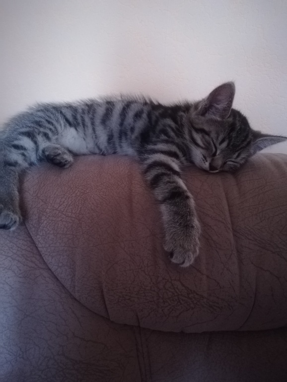 Днём котик кушал совсем мало, но исправно сам бегал на лоток. К вечеру хорошо освоил гостиную. А так же вечером уже хорошо и с аппетитом покушал. Ночь прошла спокойно я встала в восемь и искала его. Спал он за диваном. Впрочем как и днем, спит за диваном, просыпается кушает и играет. Играет очень много, ещё маленький и не может контролировать коготки, полюбились ему ноги мужа, постоянно на них прыгает. По дивану устраивает забеги. Вот как то так.