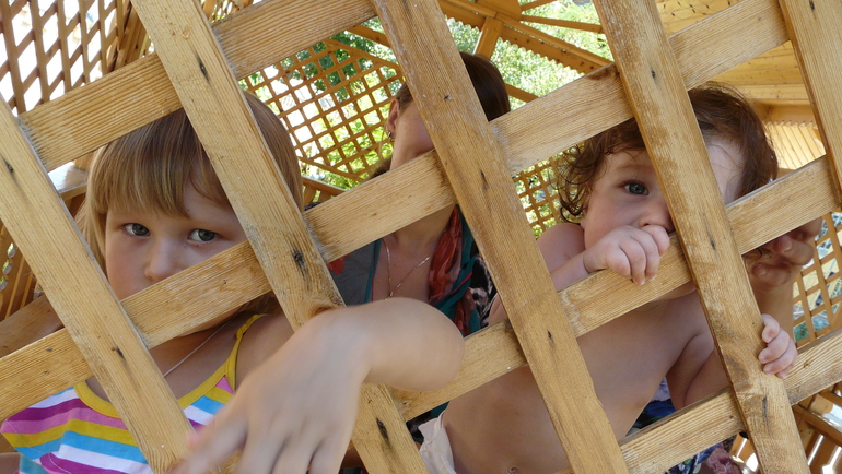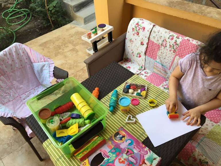 Дашуня первые дни просыпалась в 7 утра и, заходя к нам в спальню, бодро приветствовала: "Доброе утро!" :). Сама умывается, одевается и выходит во двор. Заходит уже в 20-21 часов - спать ложится. Весь день на улице. На веранде мы кушаем, проводим занятия или просто сидим общаемся.