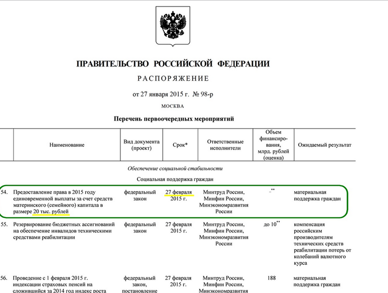 Обновление от 28.01.2015 года: Дмитрий Медведев подписал распоряжение о предоставлении в 2015 году права на частичное обналичивание средств материнского капитала в размере 20 000 рублей.