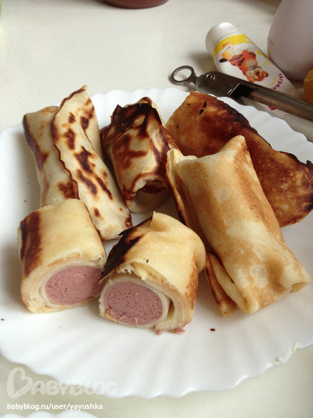 Даша, обнаружив в киоске шаурму вместо блина с сосиской расстроилась и потребовала дома сделать, вот и сделала на какой-то завтрак в выходной.