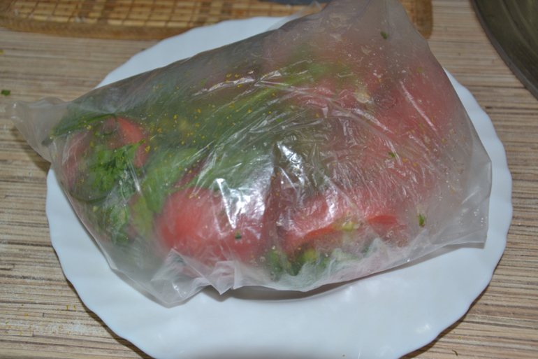 Завязать внутренний мешок, наружный просто завернуть. На сутки в холодильник, периодически переворачивать, часа через 3.