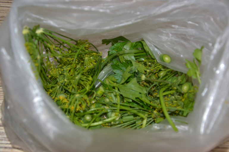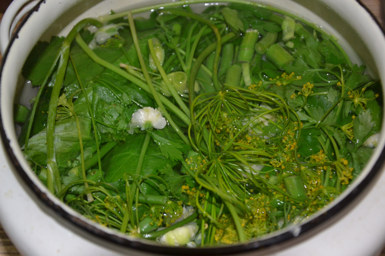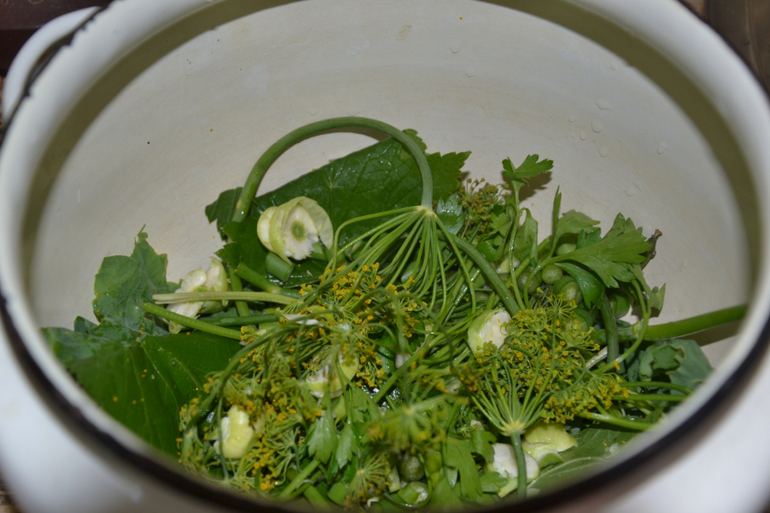 пучок петрушки, укропа, большой лист хрена, штук 10 листьев смородины или черемухи, 10 чесночных стрелок.