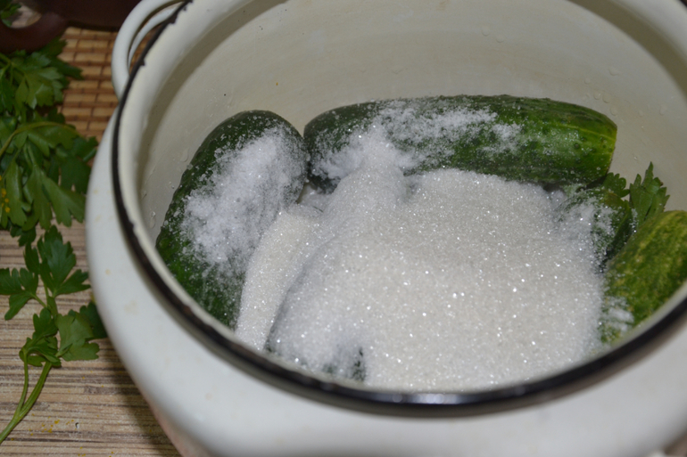 На дно кастрюли положить половину зелени (чесночные стрелки порезать), огурцы с отрезанными кончиками спереди и сзади. Соль, сахар.