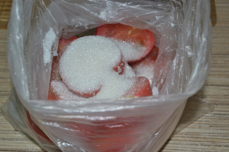 выложить половинки помидоров, пересыпать солью и сахаром - по 1 ст.л. с горкой, аккуратно перемешать все.