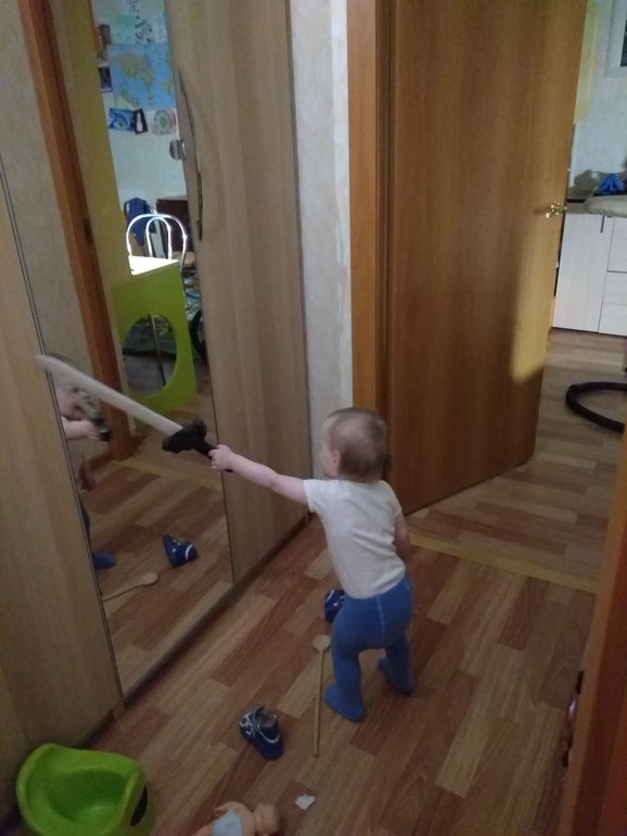 В бодик меч пихает. Как в ножны. Сегодня била кису. Та укусила за руку. И убежала на 2 этаж кровати. Ирка лазила на подоконник. Мы диван передвинули. За ним образовалась ниша. Там прячется Саня со своими игрушками. Играет. А Ирка по дивану прыгает и возмущается. Пипец короче. Очень хочу уже в треху переехать.