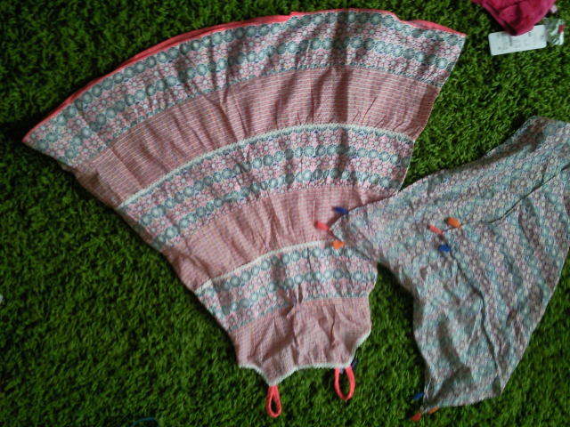 костюмчик из шифона юбка на резинке тоже талия 23см тянется до 32,топик на завязках внизу и вверху за 600руб,очень красиво смотрятся оба костюмчика на девочке