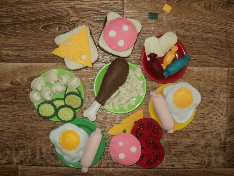 Решила я для дочки сшить фетровую еду, а то бедному ребенку трудно готовить воображаемые обеды. О, как же она радовалась, подгоняла меня, буквально из рук выхватывала новинки. Кормила папу разными блюдами, изобретала новые сочетания))) Я такого даже не ожидала, мне казалось ей в три года это будет не интересно еще. В общем вот итог двухчасовой работы(больше мы не успели, наш папа попросил еды настоящей, а не фетровой))))
