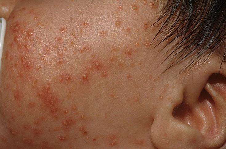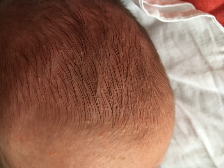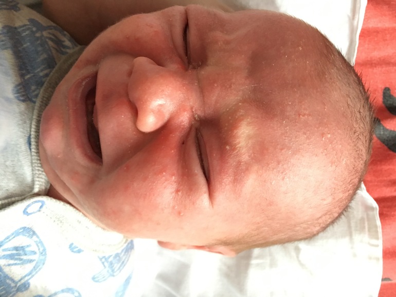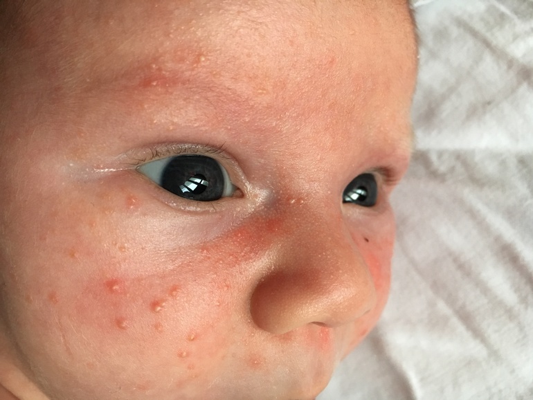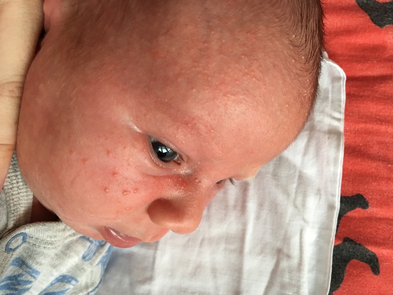 Появилось на лице, голове и шее. Нам 3 недели. Малыш очень беспокойный, кричит . Подскажите что это?