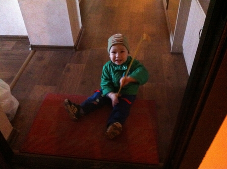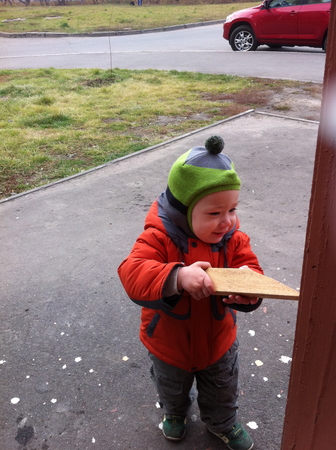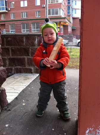 ----------------------------------------------------------- Говорит имена: Андрюша (сначала был Адрюш), мама Женя/Зена, папа Артём/Атём, баба Надя. ----------------------------------------------------------- Сам себя начал развлекать. Дяди и кисы конечно вне конкуренции, с ними может и сам играть. С парковкой тоже. Кисы должны быть "серые... пушистые... с хвостиком" )))))) Залазит на самый верх "Раннего старта", просит пройти сверху по перекладинам. Сам себя щекочет: берет из ящика скалку с 2 ручками, катает по животу и говорит "щекотно" ))