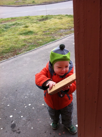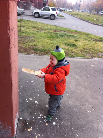 Нашёл палку и "сверлит" колонну с характерным звуком и эмоциями ))