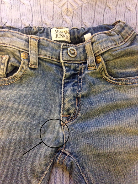 Джинсы Armani. 4г. Марк.106см. БУ активно, есть нюанс в виде какого-то посветления-растяжения у ширинки (см.фото) На ребенке не заметно, сидят классно. 400 р