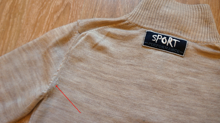 Есть дефекты! ребенку мешала бирка на спине - пришлось отрезать, а она была ввязана, поэтому получились дырочки, которые я зашила. С лицевой стороны пришила бирку-нашивку, чтобы зашивок совсем не было видно. Еще есть незаметная зашивка по шву рукава (см. красную стрелочку на фото) Если об этих дефектах не знать, то ничего не заметно. Все фото прикрепляю, чтобы можно было рассмотреть подробно.