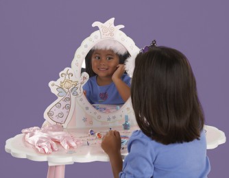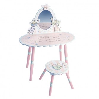 Изображения волшебных веселых фей украшают эту табуретку и чудесный туалетный столик с волнистыми краями и безопасным зеркалом из майлара.